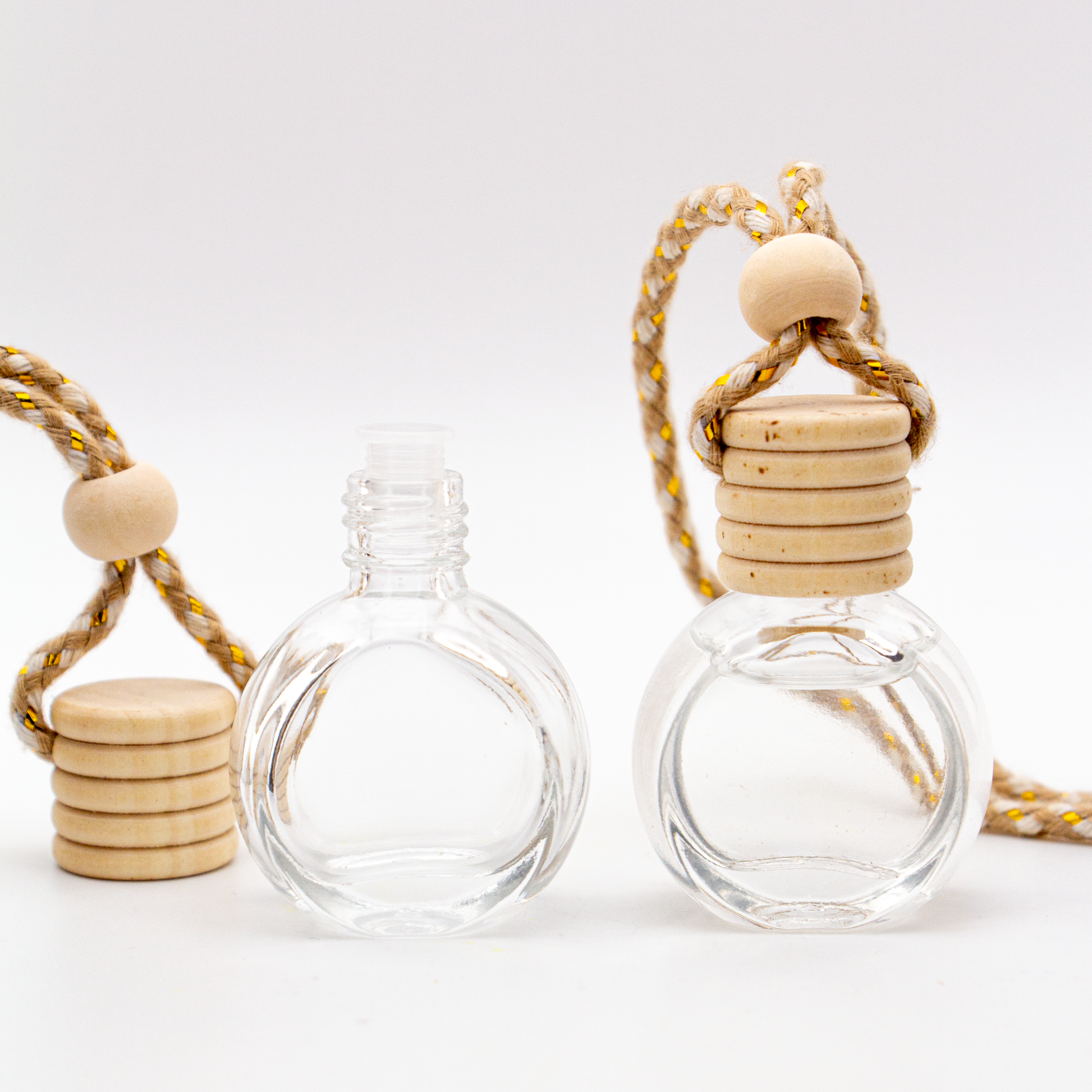 Difusor Aromático / Aromatizante para Auto / Carro – Frasco Colgante Recargable de Vidrio y Madera Redondo - Transparente 10ml