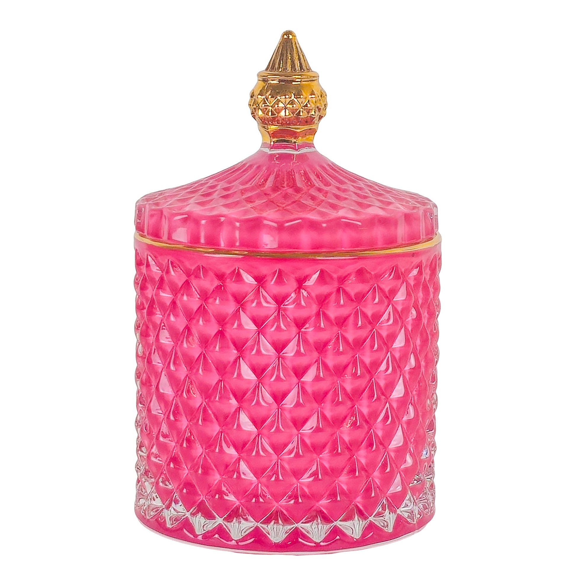 La Colección París es sinónimo de lujo y sofisticación. Este frasco de vidrio con relieve en forma de diamante destaca por su exclusivo borde y tapa bañados en oro real, aplicados mediante un proceso de alta calidad que garantiza un brillo refinado y duradero. Su diseño elegante lo convierte en un verdadero centro de atención, ya sea como envase para velas premium, objeto decorativo o frasco para dulces o galletas.